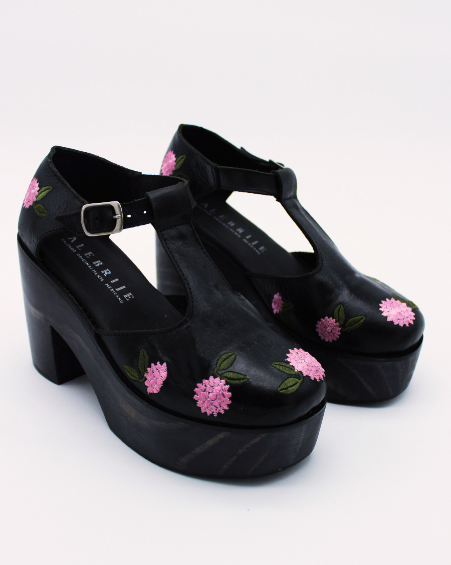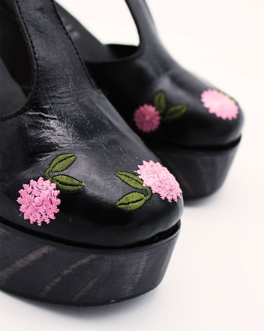 El modelo DALIA es la fusión entre el clásico Mary Jane y el zueco de madera dando como resultado un zapato de mujer con un bordado único.